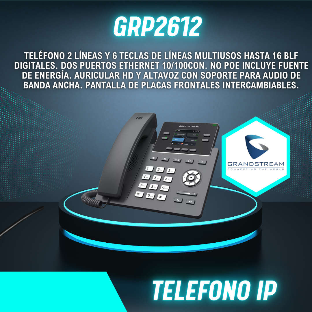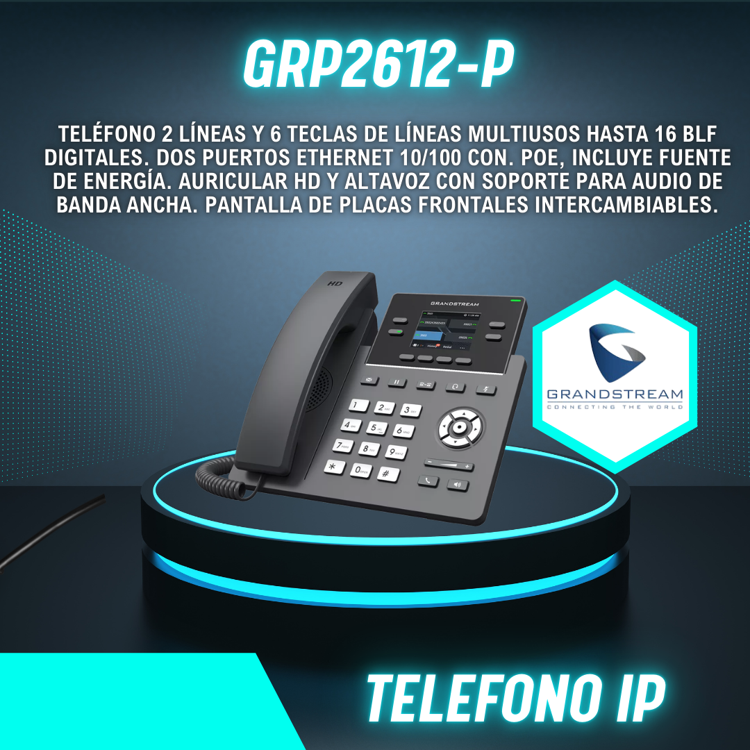 Teléfono 2 líneas y 6 teclas de líneas Multiusos hasta 16 BLF digitales. Dos puertos Ethernet 10/100con. Poe, Incluye fuente de energía. Auricular HD y altavoz con soporte para audio de banda ancha. Pantalla de placas frontales intercambiables.