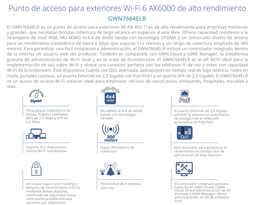Es un punto de acceso WiFi 6 de largo alcance antenas 4×4 diseñado para proporcionar un soporte de cobertura extendida de hasta 350 metros. Debido a su carcasa es resistente al agua y resistente al calor, diseño para exteriores. Permite 750 dispositivos conectados.