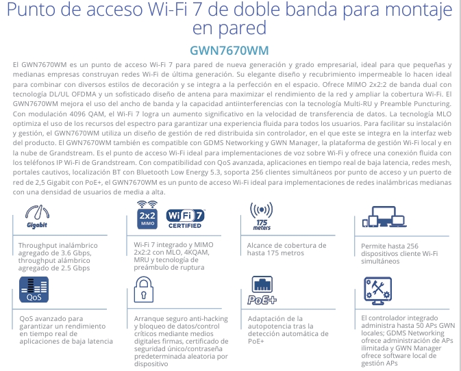 Punto de acceso Wi-Fi 7 montaje en pared con una densidad de usuarios de media a alta. Rendimiento inalámbrico agregado de 5,4 Gbps, puertos cableados de 3,5 Gigabit Tri-Band 2×2:2 MU-MIMO con tecnología DL/UL OFDMA, 4KQAM, MRU y Preamble Puncturing, alcance de cobertura de hasta 175 metros, admite 256 dispositivos cliente Wi-Fi simultáneos, QoS avanzado para garantizar el rendimiento en tiempo real de aplicaciones de baja latencia.